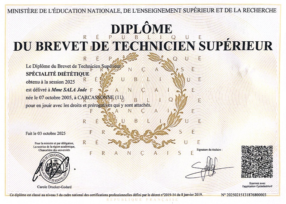 Je m’appelle Jade, j’ai 20ans, je suis diététicienne-nutritionniste diplômée d’un BTS diététique et passionnée. J’accompagne les personnes vers une meilleure santé grâce à une alimentation adaptée, bienveillante et sans restriction inutile. Passionnée par l’activité physique, je crois profondément que bouger régulièrement est aussi important que bien manger.